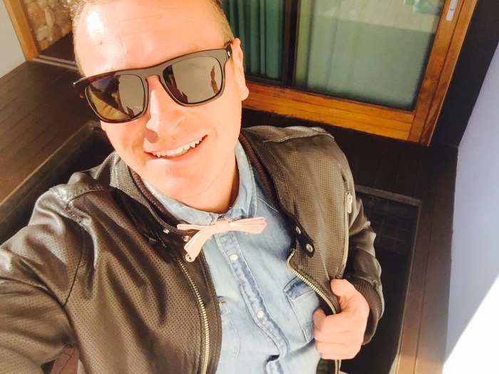 You may wear it with a peach pocket square and the blue jacket, brown shoes and white pants of going to a summer party – or do it the more casual was as on my pic with jeans shirt (All Saints) and leather biker jacket (Diesel).