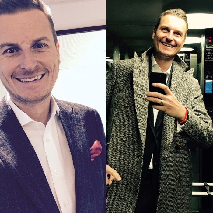 Today’s look was for business meeting with potential business partners inspired by Suitsupply. Brown suit with beige pinstripes. A double-breasted coach withherringbone pattern, also Suitsupply. Simple white shirt, but worn with dark red cufflinks matching the pocket square und socks. Brown tassel loafers from Saks OFF Fifth.