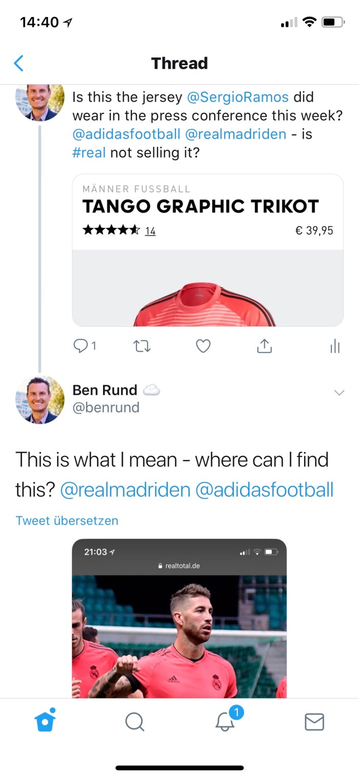 Adidas is the equipment partner of Real Madrid as you know. After not finding it on the web shop of Real or Adidas, I started social outreach.